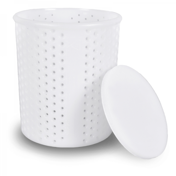 Diese kleine Käseform hat einen Innendurchmesser von 75 mm und eine Höhe von 90 mm. Bei der Käseherstellung kannst Du ca. 100 g Käse in diese Form füllen. Die Löcher und der Boden der Käseform dienen dazu, dass die Molke aus dem Käsebruch gut ablaufen kann. Daher ist es sinnvoll, dass Du die Käseform auf ein Abtropfgitter über eine Wanne stellst, damit sich die Molke darin sammeln kann. Zu dieser Käseform gehört der dazu passende Pressdeckel.