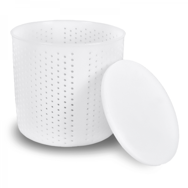 Der Käsebruch kommt in diese Käseform, damit die Molke gut abfließen kann. Am besten stellst Du die Käseformen mit dem Käsebruch auf ein Gitter über eine Wanne oder ein Abtropfbecken, damit die austretende Molke direkt aufgefangen wird. Diese runde Käseform mit einem Innendurchmesser von 96 mm und einer Höhe von 92 mm kannst Du vor allem bei der Herstellung von Frisch- und Weichkäse einsetzen. Es passen ungefähr 200 g in eine Form. Zu dieser Käseform gehört der dazu passende Pressdeckel.